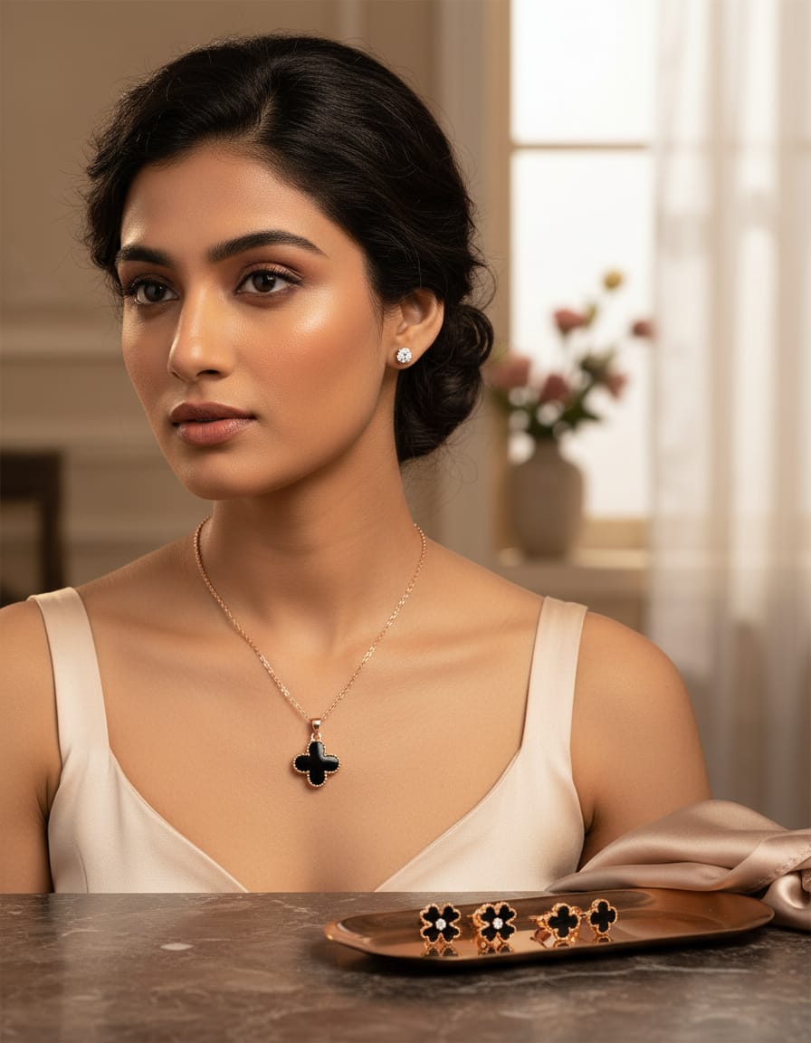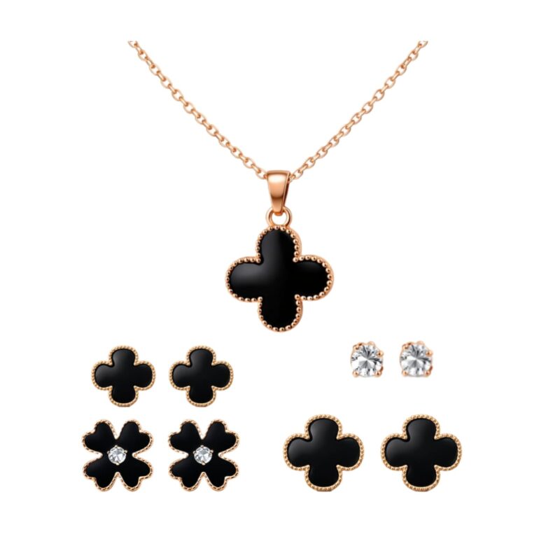 Black Clover Pendant Necklace & Stud Earrings Set for Women