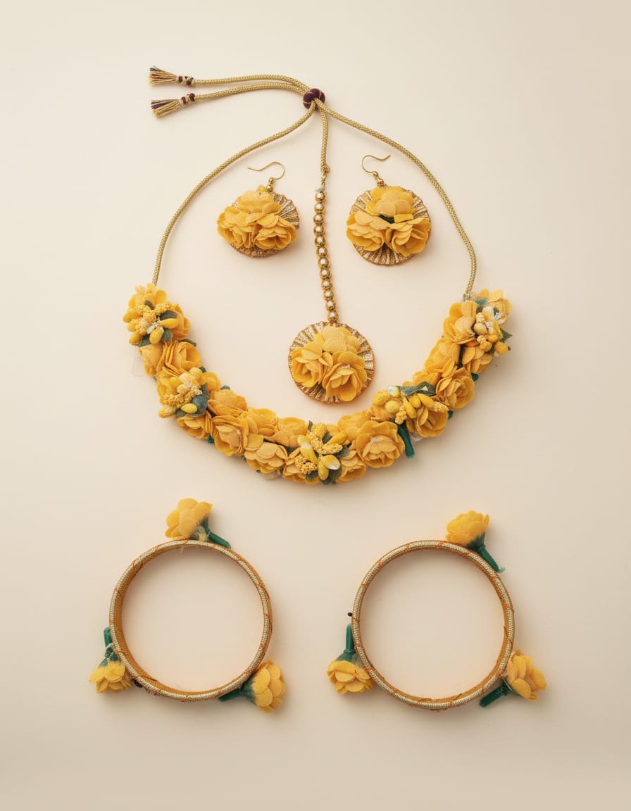 Yellow Floral Haldi Jewellery Set with Necklace, Earrings & Bangles for Women